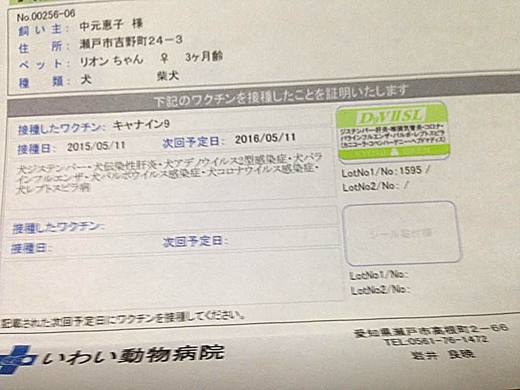 พอไปสอยมาเสร็จเลยแวะไปหาสัตวแพทย์ ถามดูว่าจำเป็นมั้ยที่สองหน่อจะต้องฉีดวัคซีนเพิ่ม คำตอบที่ได้มาคือเก็นโบ้ต้องทำวัคซีนใหม่ทั้งหมดเพราะว่าฉีดวัคซีนรวมไปแค่ 1 เข็ม และริอ้อนฉีดเพิ่มแค่เข็มเดียว เป็นวัคซีนรวม 6 โรค หน้าหลังจากโดนจิ้มมา 555
